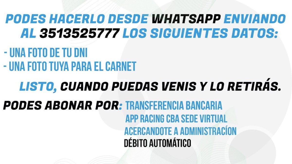 👉Podes abonar por transferencia bancaria, APP RACING CBA Sede Virtual y acercandote a administración.