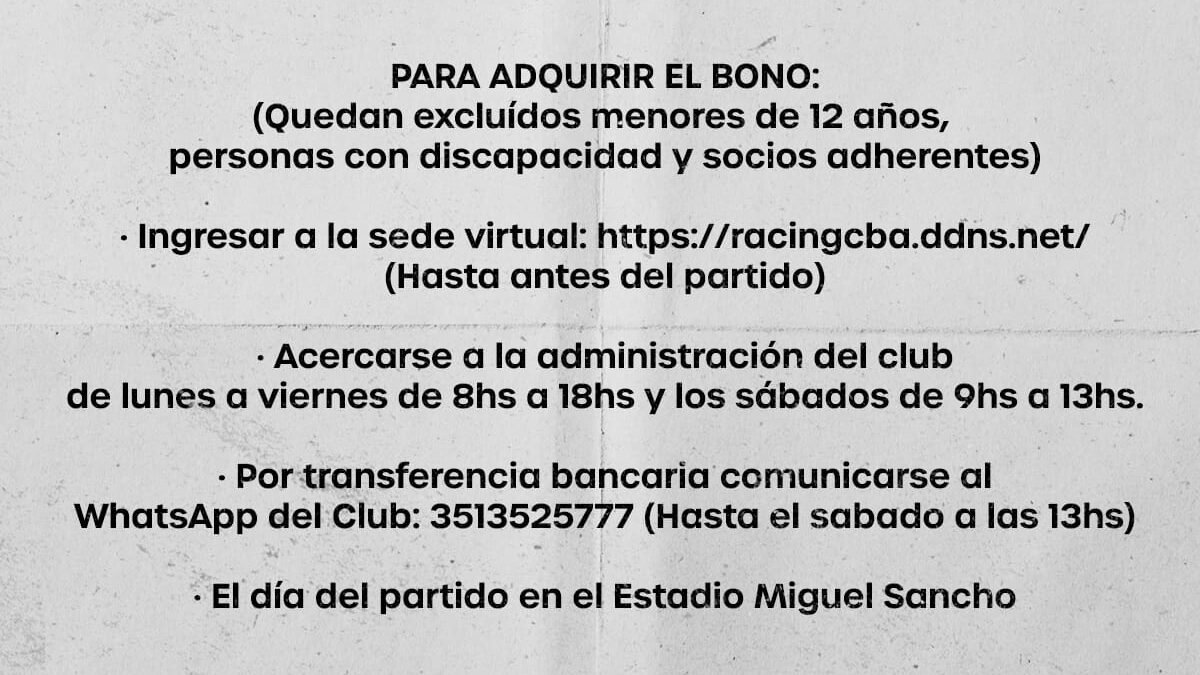 * Ingresar a la sede virtual: https://racingcba.ddns.net/ (hasta antes del partido).